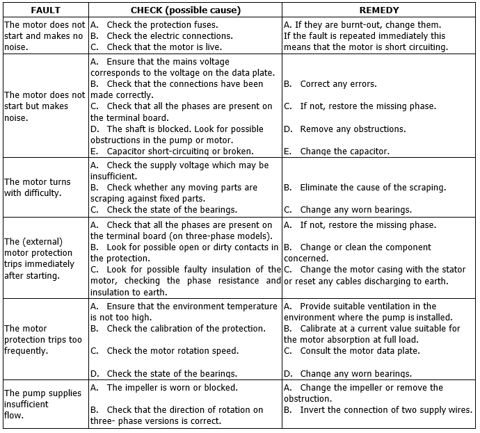 Before starting up you must fill the system with water and bleed the air. Bleed the residual air from the pump body through the bleeding cock provided until only water comes out. This ensures that the mechanical seal is well lubricated and that the pump immediately starts to work regularly. Dry operation, even for brief periods, causes irreparable damage to the mechanical seal. Switch on the power and, on three-phase versions, check that the motor is turning in the right direction, that is clockwise when viewed from the fan side. If it is turning in the wrong direction, disconnect the power and exchange any two phase leads, after having disconnected the pump from the mains. With the pump running, check the supply voltage at the motor terminals, which must not differ from the rated value by +/- 5%. With the unit at regular running speed, check that the current absorbed by the motor does not exceed the value on the data plate.